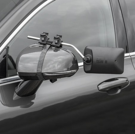- Befestigung mit 2 Clips und Gummiband um den Außenspiegel